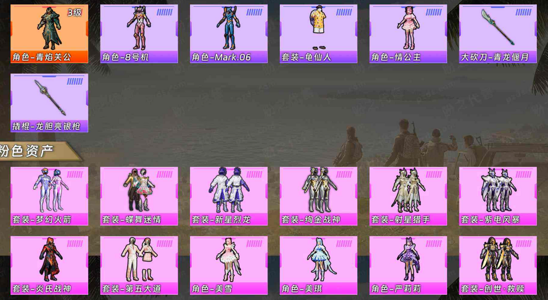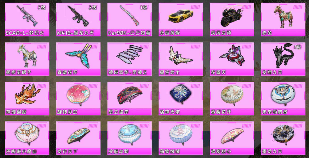 【1神装:12粉装:3粉枪:4载具】红关公❤粉螳螂❤蓝螳螂❤梦幻火箭❤第五大道❤