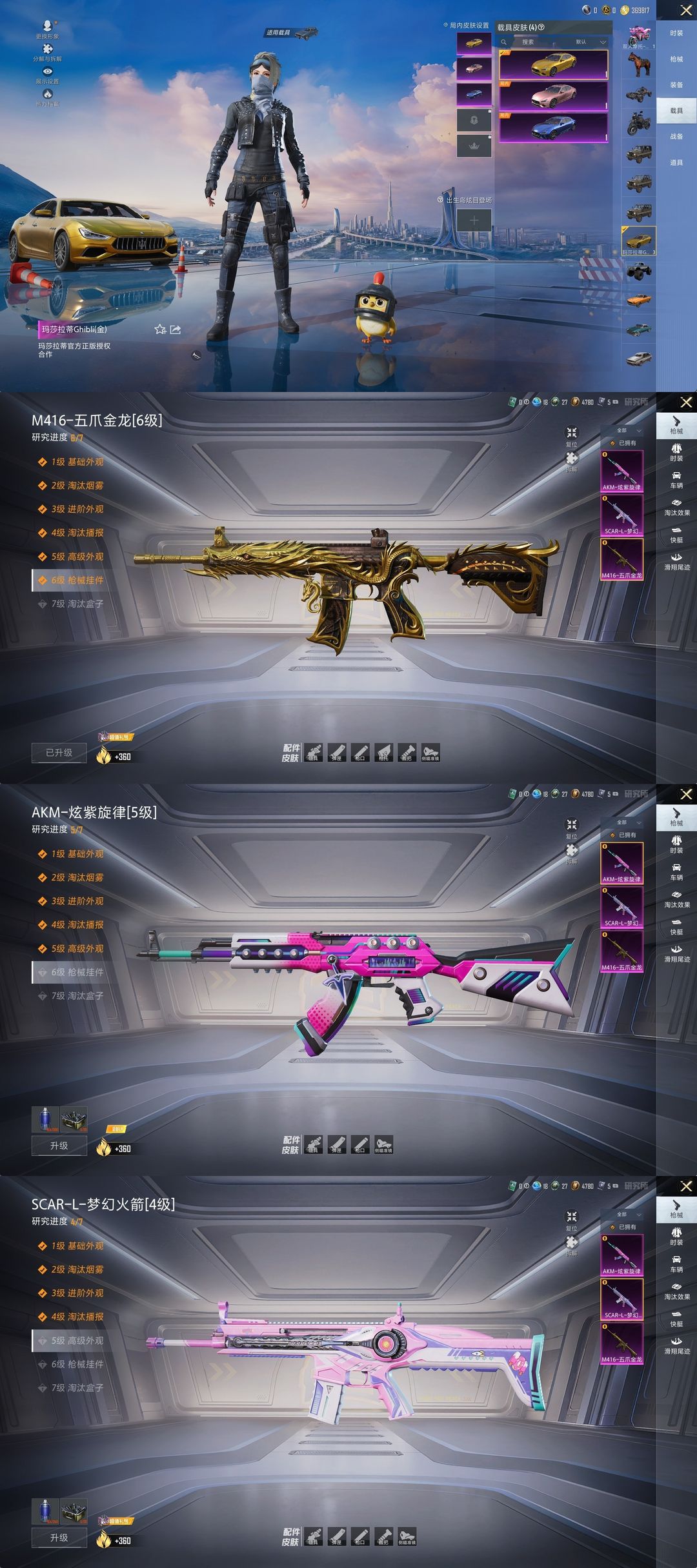 限制: 撤单率<70%才可租用此帐号装备描述:非速玩!6粉3枪4载具!梦幻火箭全套都市猎人金玛莎蓝玛莎粉玛莎M4五爪金龙
