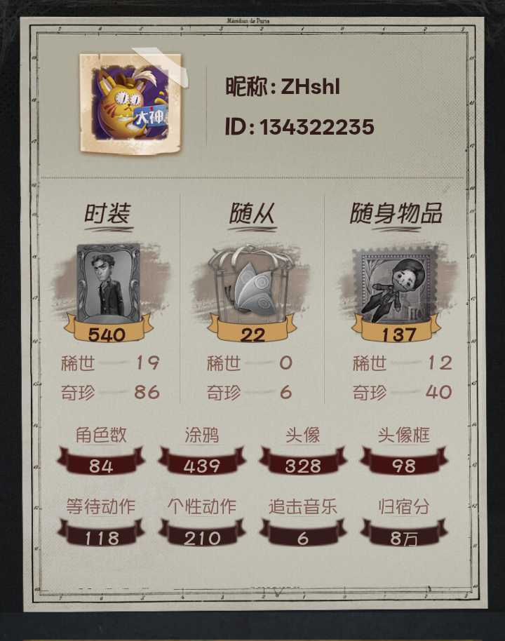 装备描述:金数量=金皮+金挂, 禁止游戏内刷喇叭说卖号骗人,抓一次直接永久拉黑 禁止开挂,本账号经过网络财产备案,一直发现直接报警处理 不会登陆的租客请下载taptap找第五人格下载游戏,随意撤单必拉黑。